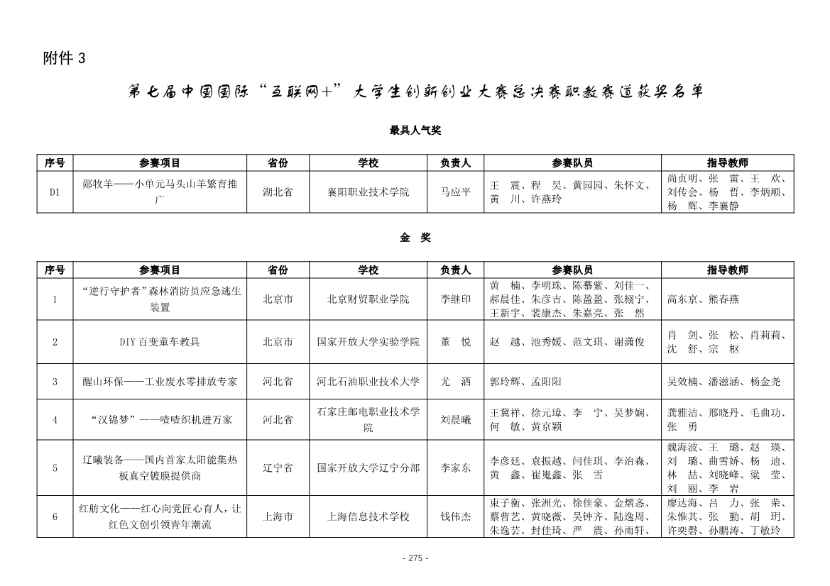 第七届中国国际“互联网+”大学生创新创业大赛总决赛职教赛道获奖名单