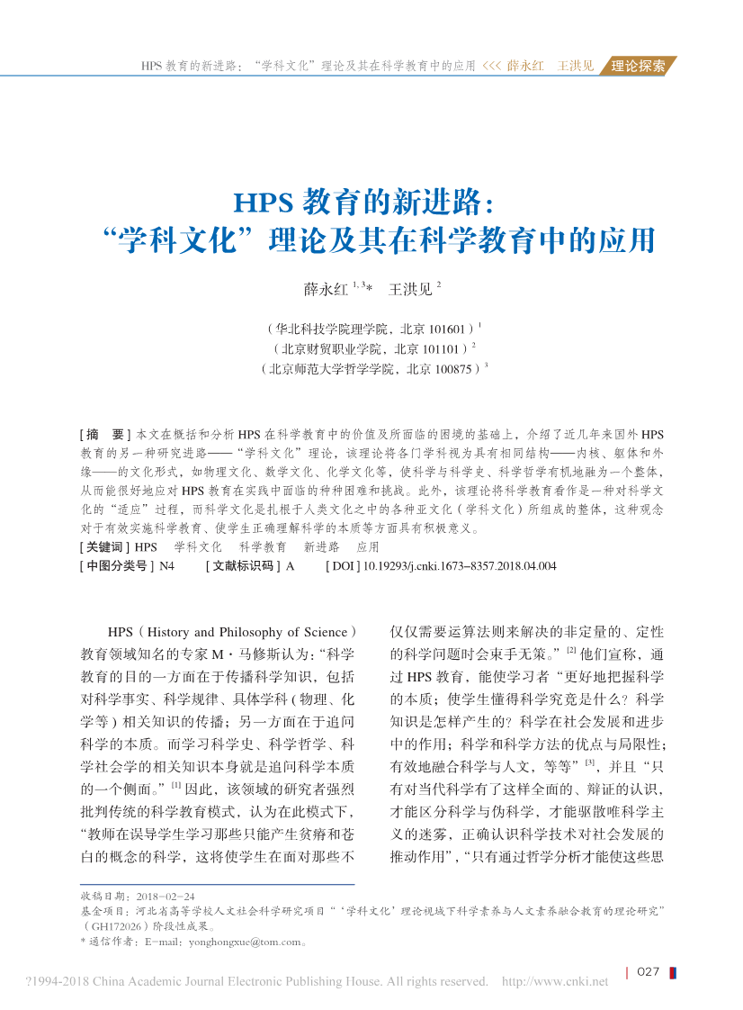 117.HPS 教育的新进路:“学科文化”理论及其在科学教育中的应用